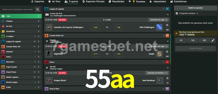O 55aa oferece uma grande seleção de opções de apostas em e-sports com probabilidades competitivas